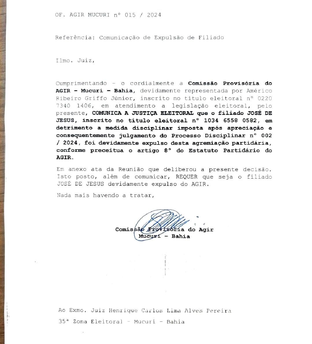Amparado por vasto material comprobatório – como fotos e vídeos compartilhados pelos próprios candidatos em redes sociais - a comissão provisória decidiu pela expulsão dos filiados José de Jesus (Zé Pedreiro) e John Vitor Santos Ribeiro (John do Lavador). A decisão se ampara no artigo 8° do Estatuto Partidário do AGIR.