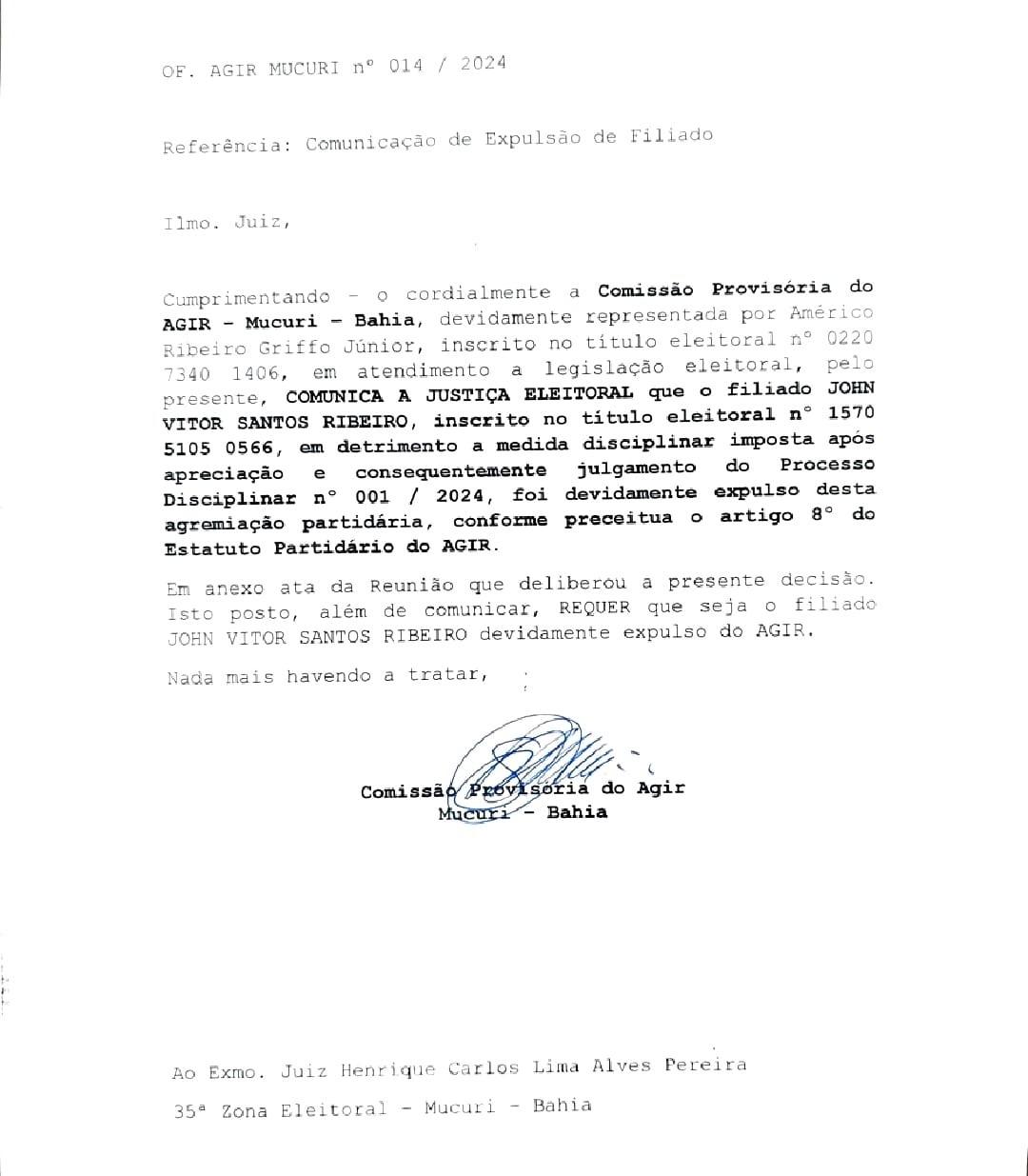Na decisão, a Comissão Provisória do AGIR de Mucuri decidiu por acionar a Justiça Eleitoral sobre Ação de Cancelamento do Registro de Candidatura dos filiados Zé Pedreiro e John do Lavador, visto a expulsão em prol da infidelidade partidária.